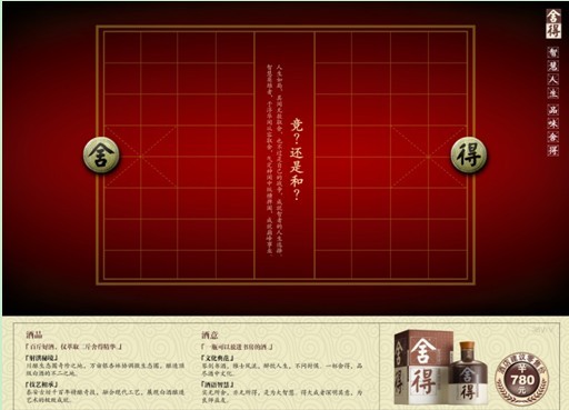 人們所常說,“民族的才是世界的”,這是因為只有具有自己的民族風格特色,才能夠得到世界人民的喜愛,這其中也體現了共性與特性的矛盾的關系,如果一個品牌想打造成為國際品牌,卻放棄了其民族化的一面,刻意強調其國際化的品牌風格,這就將造成品牌空洞化的毛病,反而缺乏個性,無法讓全世界的消費者記住這個品牌。舍得酒在保持民族性方面就做的非常到位,品牌廣告訴求、品牌氣質的把握非常精準。僅從包裝而言,具有厚重的中國傳統文化氣質,其黑白相間的盒體包裝正暗合了“天與地”“陰和陽”“上與下”“左和右”……等和諧相生的統一,格調雅致,別有風味更顯得平靜和理性。整個瓶體和包裝造型無不透出中國陰陽兩極相生的哲學智慧,米字格中顏體“舍得”二字,融入中國的書法文化,更加凸顯了舍得酒的中國傳統文化氣質。