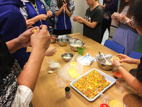 瑞豐義工團(tuán)都馬上動(dòng)手,聽從導(dǎo)師指示分工,先包燒賣和臘腸卷。