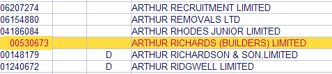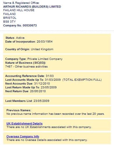 您可以在Company Name后的空格內(nèi)輸入您要查找的公司名,如:ARTHUR RICHARDS (BUILDERS) LIMITED,然后點(diǎn)擊 SEARCH,您便可以看到以下內(nèi)容 (圖示2):