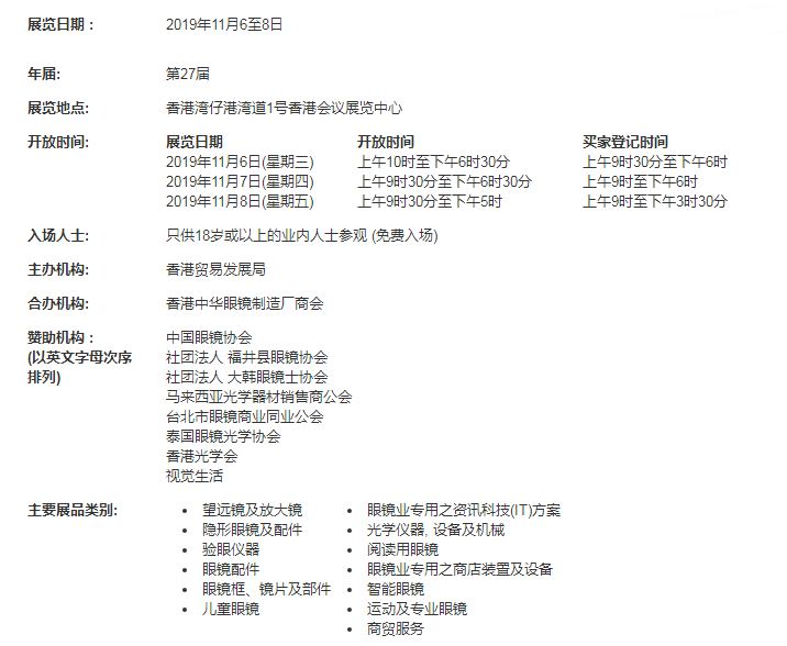 第27屆香港貿(mào)發(fā)局香港國際眼鏡展呈獻無與倫比的優(yōu)質(zhì)商貿(mào)平臺, 讓參展商與環(huán)球買家建立聯(lián)系。2018年眼鏡展吸引來自111個國家及地區(qū)超過16,800名買家到場參觀采購,較對上一年上升4%,并云集810家參展商,打破歷屆紀錄。