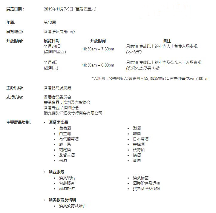 由香港貿易發展局主辦的第十二屆香港國際美酒展(美酒展)于2019年載譽重來,再度展出各種各樣香醇佳釀,為業界締造超乎所想的發展機遇。這項備受矚目的盛會已成為不可多得的美酒交易和采購平臺,展覽為期三天,將假灣仔香港會議展覽中心舉行,匯聚來自世界各地優質葡萄酒和烈酒業界有影響力的買家、專家和品酒大師。美酒展于2018年吸引來自73個國家及地區,近1萬9千名買家入場參觀,進一步鞏固香港作為葡萄酒貿易中心的領先地位,同時確保一千多家優質國際參展商取得豐碩成果,開拓商機。