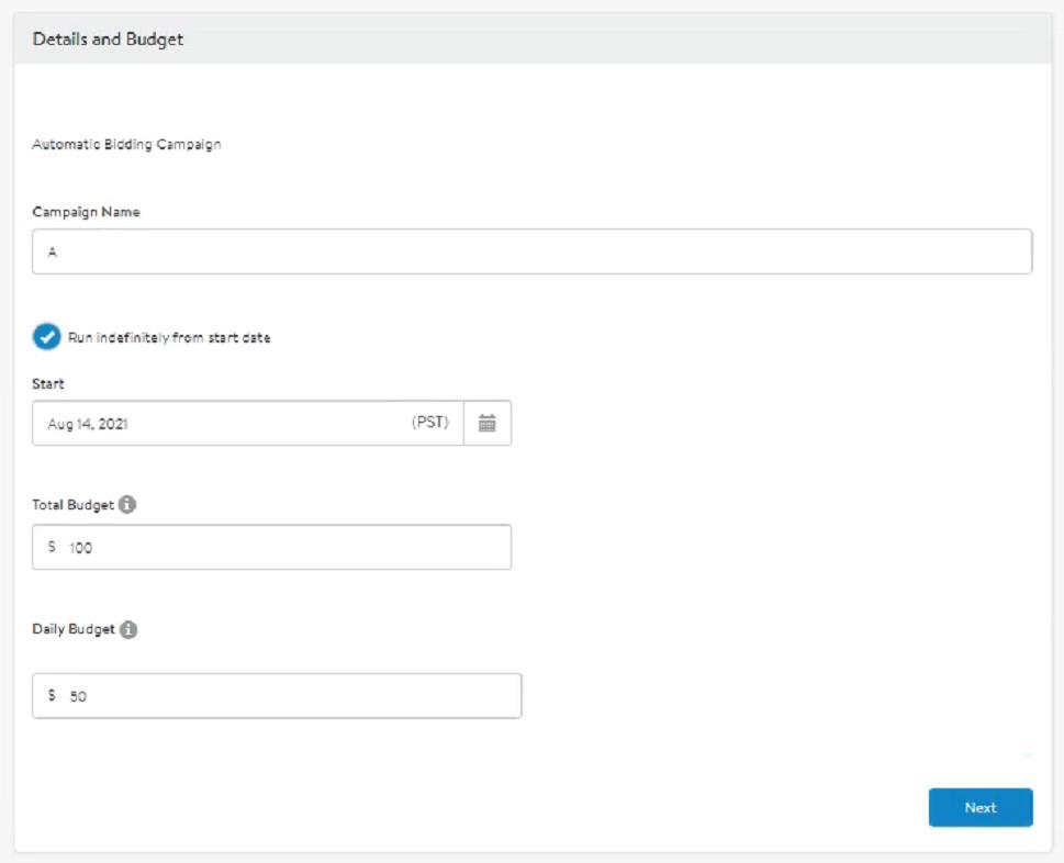 第 4 步:如圖4所示,輸入活動名稱并設置開始日期。你可以在此處選擇廣告的總預算以及每日預算。總預算必須至少為 100 美元,每日預算必須至少為 50 美元。
