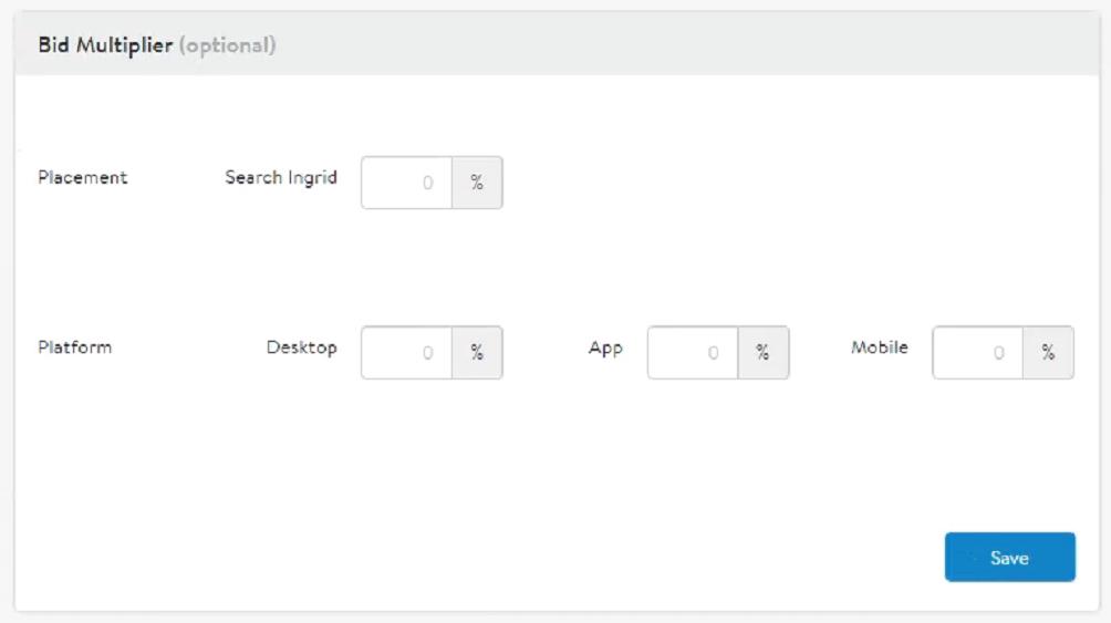 你可以選擇在購買按鈕(僅限自動廣告)和搜索展示位置上設置出價乘數。此外,你可以選擇你的Walmart廣告顯示在桌面設備還是移動設備(App or Mobile)上。