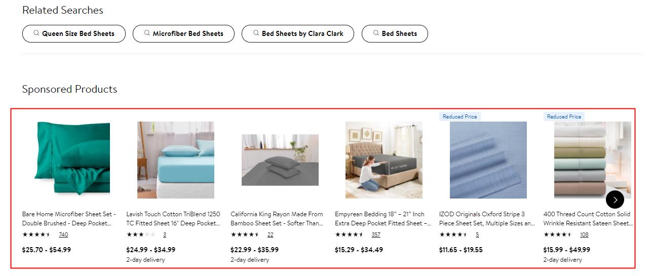 如圖10所示,贊助商廣告可以出現在 Walmart.com 的幾個不同位置。它們通常出現在搜索結果頁面中,產品購買框下方,或者出現在搜索頁面、產品頁面上的產品輪播中。