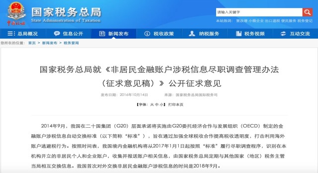 國家稅務(wù)總局于 2016 年 10 月 14 日在官方網(wǎng)站上就非居民金融賬戶涉稅信息盡職調(diào)查管理辦法(征求意見稿)》公開征求意見。中國將于 2017 年 1 月 1 日實(shí)施新的賬戶開戶程序,首次對外交換非居民金融賬戶涉稅信息的時(shí)間是 2018 年 9 月。