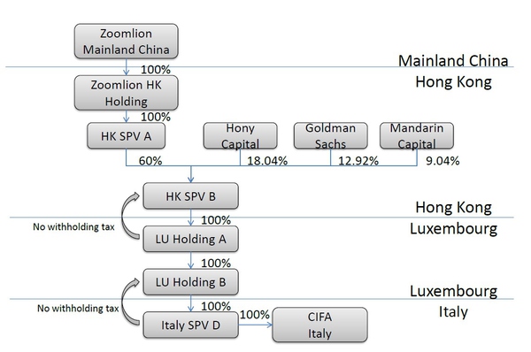 3. CIFA Italy是在意大利的實際有產出的公司,如果意大利業務擴展,可以在CIFA同級別再設立其他子公司單控項目。為確保意大利其他項目不受CIFA單個項目的影響,多加了Italy SPV D為主控,并且在盧森堡上層結構變動時也不會波及意大利項目公司的股權結構。