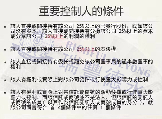 這里需要重點關注一下“公司指定代表”的幾個重要條件,現在市場很多小的香港公司注冊中介和代理可能無法達到上述要求,因此在辦理“備存重要控制人登記冊”的時候,一定要找符合條件和資質的機構來做,否則可能出現錢花了事情未辦妥的情況。