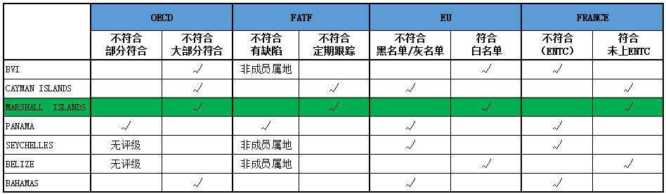 目前,在國際上對于離岸屬地進行合規評級的主要有歐盟ECOFIN,國際經合組織(OECD)以及反洗錢金融特別工作組(FATF)。而在國內常見的離岸屬地中,同時加入各機構評級又都在白名單上的海外屬地只有馬紹爾群島