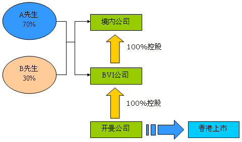 3、接著,對BVI公司增資,再與A先生和B先生進行股權轉讓,收購他們擁有的內地公司的股權,則內地公司變為BVI公司的全資子公司。BVI公司在開曼群島或百慕大群島注冊成立一家離岸公司作為日后在香港掛牌上市的公司。